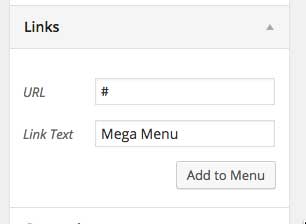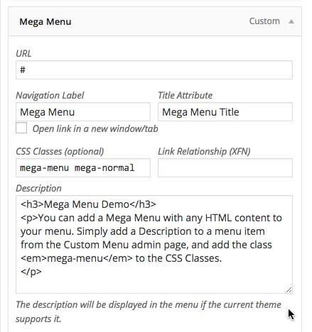 - Define the MegaMenu's content. You should fill in a # for the URL location. You can provide a Title Attribute if you wish. To make this menu item a MegaMenu, you add mega-menu to the CSS Classes box. Finally, define the content of the MegaMenu drop down using arbitrary HTML.