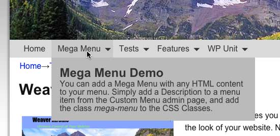 The width of your MegaMenu also takes specification. By default, the width is 25em. The only way to adjust the width is with a custom CSS rule, usually added to the Custom CSS Rules box on the Weaver Xtreme Fonts & Custom tab.