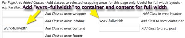 - On the Page that will display the Parallax posts (either a Page with Posts, or a standard Page using [show_posts]), add the class wvrx-fullwidth to the Add Class to area: container and Add Class to area: content options.