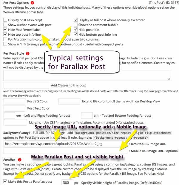 - Step 2 is more of a do not do: Do not check the "Do not make BG image full width of enclosing area" option on the Per Post option box (although you can check this on some of your Parallax posts to achieve some interesting variety.